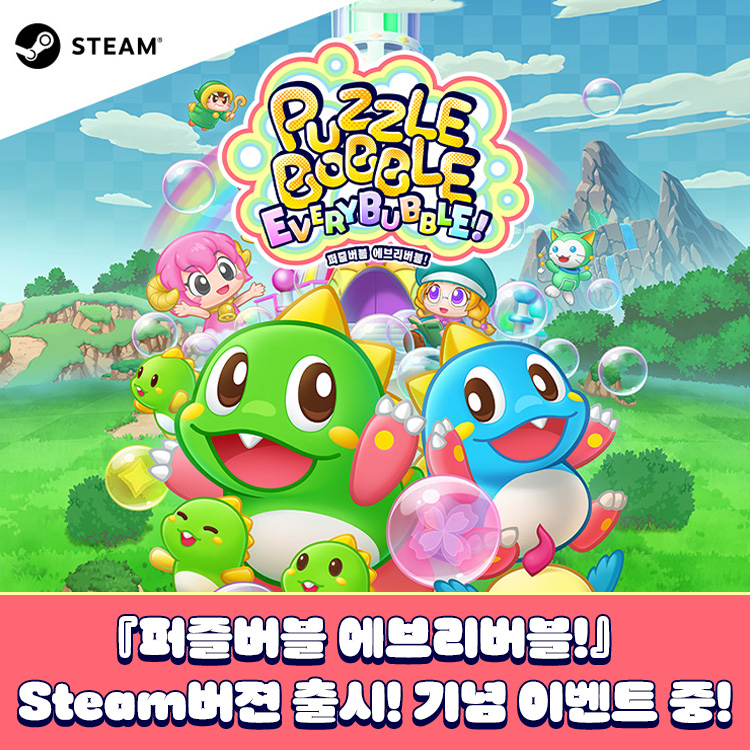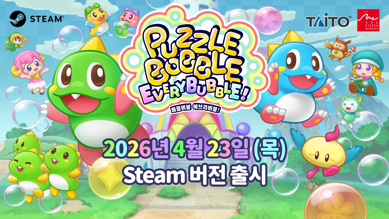 아크시스템웍스아시아 주식회사는 주식회사 타이토가 개발한 『퍼즐버블』 시리즈 최신작 「퍼즐버블 에브리버블!」의 Steam 버전이 오늘 (23일) 출시되었다고 발표하여, 출시를 기념하여 세일 행사와 SNS 이벤트를 개최한다고 밝혔다.■ Steam 버전 『퍼즐버블 에브리버블!』 트레일러■ Steam 버전 『퍼즐버블 에브리버블!』 출시 기념 20% 세일!「퍼즐버블 에브리버블!」의 Steam 버전 출시를 기념하여, 오늘 (23일)부터 5월 6일 (수) 2주 동안 Steam에서 기간 한정 20% 특별 세일이 진행된다.・출시 기념 세일 기간: 2026년 4월 23일 (목) ~ 5월 6일 (수)・할인율: 20%● 「퍼즐버블 에브리버블!」 Steam 페이지https://store.steampowered.com/app/3990960/PuzzleBobble_EveryBubble/■ Steam 버전 『퍼즐버블 에브리버블!』 출시 기념 이벤트Steam 버전 『퍼즐버블 에브리버블!』 출시를 기념하여, 추첨을 통해 『퍼즐버블 에브리버블! 특제 마우스 패드』를 증정하는 SNS 이벤트가 오늘부터 개최된다.● 이벤트 참여 기간: 2026년 4월 23일 ~ 2026년 5월 10일● 추첨 사은품: 『퍼즐버블 에브리버블! 특제 마우스 패드』 (3명)● 이벤트 참여 방법:1. 아크시스템웍스 아시아의 공식 X(구 트위터) 계정(@ASW_ASIA) 혹은 인스타그램 계정(@arcsystemworks_asia)을 팔로우2. Steam 버전 『퍼즐버블 에브리버블!』의 출시 기념 이벤트 게시물을 X에서 ‘재게시(리트윗)’, 혹은 인스타그램에서 이벤트 게시물에 ‘좋아요’를 누르면 이벤트 참여 완료● 아크시스템웍스 공식 X(구 트위터): https://twitter.com/ASW_ASIA● 아크시스템웍스 공식 인스타그램: https://www.instagram.com/arcsystemworks_asia/● 당첨자 발표: 2026년 5월 15일 (금) 아크시스템웍스 아시아 공식 SNS를 통해 발표■ ‘버블룬’이 돌아왔다! 액션 퍼즐의 익숙한 재미는 그대로, 새로운 요소는 한가득!「퍼즐버블 에브리버블!」은 마법사의 저주로 섬 전체가 버블로 가득 차버린 ‘레인보우 아일랜드’를 무대로, ‘버블룬’, ‘보블룬’, ‘쿠루룬’, ‘코로론’이 모여 모험을 펼치는 액션 퍼즐 게임으로, 같은 색의 버블 3개를 위로 쏘아 올린 후 맞혀서 터트리는 심플하면서도 심오한 규칙을 유지하면서도 이번 작품만의 새로운 요소가 가득 탑재되어 있다.■ 『퍼즐버블』 시리즈 최초! 스토리 모드에서 최대 4인 협력 플레이 지원!스토리 모드에서 시리즈 최초로 최대 4명까지의 협력 플레이를 지원하는 것이 주요 특징으로, 혼자서 느긋하게 즐길 수 있는 것은 물론, 가족이나 친구와 함께 협력해서 스테이지를 공략하는 즐거움도 느낄 수 있다.■ 다채로운 콘텐츠! 다양한 기믹의 스테이지와 유니크한 게임 모드모험의 무대가 되는 ‘레인보우 아일랜드’ 각지에서는 엔드리스 스테이지 『스컬 타워』는 물론, 『스페이스 인베이더』와의 콜라보레이션 미니 게임, 『퍼즐버블vs인베이더』를 즐길 수 있다.■ 충실한 대전 모드 수록!전 세계 플레이어와 정점을 향해 나아가는 ‘온라인 대전 모드’와 함께, ‘로컬 대전 모드’에서는 최대 4명이서 즐길 수 있는 팀 대전을 실현하여, 2vs2 협력 대전과 같은 다채로운 규칙으로 플레이할 수 있다.■ Nintendo Switch™ 「퍼즐버블 에브리버블!」 한국어판 절찬 판매 중!Nintendo Switch™ 「퍼즐버블 에브리버블!」 또한 아크시스템웍스 아시아를 통해 패키지 및 다운로드 버전으로 절찬 판매 중이다.■ Nintendo Switch™ 「퍼즐버블 에브리버블!」 한국어판 트레일러● 「퍼즐버블 에브리버블!」 공식 사이트https://www.taito.co.jp/ko/PBEverybubble● 아크시스템웍스 아시아 제품소개 페이지https://www.arcsystemworks.asia/bbs/board.php?bo_table=products&wr_id=177& 타이틀 명 퍼즐버블 에브리버블! 출시일 절찬 판매 중 대응 기종 Nintendo Switch™: 패키지판 Nintendo Switch™, Steam®: 다운로드판 장르 액션 퍼즐 게임 플레이 인원 1~4명 ※ 온라인 플레이 최대 2명 지원 언어 사양 자막: 한국어, 중문번체, 중문간체, 일본어, 영어, 프랑스어, 이탈리아어, 독일어, 스페인어 권리표기 © TAITO CORPORATION/ Published by ARC SYSTEM WORKS