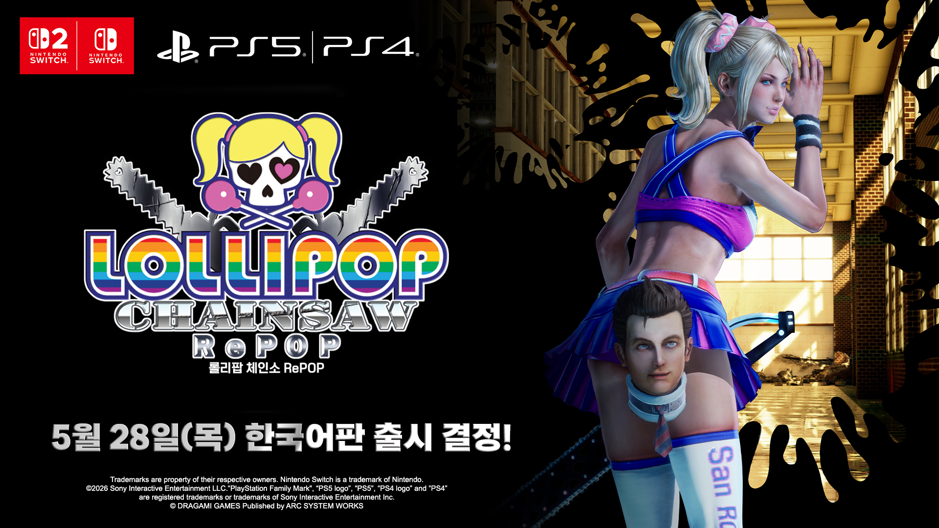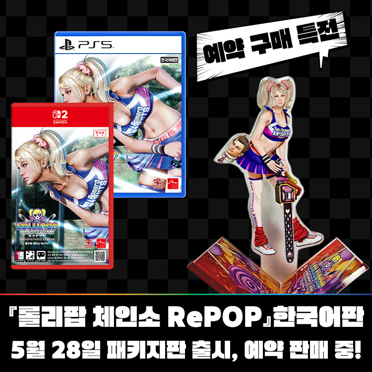 아크시스템웍스아시아 주식회사는 주식회사 DRAGAMI GAMES의 좀비 액션 게임 『롤리팝 체인소 RePOP』의 한국어 패키지판 (Nintendo Switch 2 Edition, PlayStation®5)이 오는 5월 28일 (목) 출시가 결정되었다고 발표했다. 또한 내일 (24일)부터 한국어 패키지판의 예약 판매가 시작된다고 밝히며, 예약 특전 등 상세 내용을 공개했다.※ 패키지 이미지는 예시로, 실물과 다를 수 있습니다.『롤리팝 체인소 RePOP』은 지난 2012년 6월 출시되어 전 세계 누적 판매량 124만장 이상 판매를 기록한 스타일리시 좀비 액션 게임, '롤리팝 체인소'의 리메이크 버전으로, 팝아트와도 같은 대미지 이펙트 등 독자적인 아트 스타일이 돋보이는 ‘RePOP 모드’가 추가되며, 해상도와 프레임 레이트의 향상은 물론, 게임 플레이 시의 조작감과 편의성도 개선되는 등 이번 리메이크 버전을 통해 플레이어는 더욱 쾌적한 환경에서 좀비 액션을 즐길 수 있다.『롤리팝 체인소 RePOP』 한국어 패키지판 (Nintendo Switch 2 Edition※, PlayStation®5)은 2026년 5월 28일 (목) 출시될 예정이며, 내일 (24일, 금)부터 예약 판매가 시작된다.※ Nintendo Switch 2 Edition 소프트웨어는 Nintendo Switch 본체로도 플레이할 수 있습니다. 이 경우, 플레이 내용은 Nintendo Switch 소프트웨어와 동일하며, Nintendo Switch 2의 성능을 활용한 업그레이드 내용은 포함되지 않습니다.※ 『롤리팝 체인소 RePOP』 다운로드 버전의 출시일은 추후 공개될 예정입니다.■ 『롤리팝 체인소 RePOP』 한국어 패키지판 예약 판매 안내『롤리팝 체인소 RePOP』 한국어 패키지판 (Nintendo Switch 2 Edition, PlayStation®5)의 예약 판매는 온, 오프라인의 각 스토어를 통해 내일 (24일, 금)부터 5월 26일 (화)까지 진행될 예정이며, 예약 구매 특전으로 『줄리엣 스털링 아크릴 피규어』가 수량 한정으로 증정된다.※ 예약 구매 특전 『줄리엣 스털링 아크릴 피규어』는 한정 수량인 관계로 조기 소진될 수 있습니다.※ 해당 이미지는 제작 중인 이미지로, 실물과 다를 수 있습니다.■ 『롤리팝 체인소 RePOP』 한국어판 트레일러■ 『롤리팝 체인소 RePOP』 주요 특징전설의 치어리더 좀비 헌터, 줄리엣 스털링이체인소를 들고 다시 돌아왔다!● 스토리무대는 미국 서해안에 위치한 지역 최대 규모의 매머드급 학교 ‘산 로메로 하이스쿨’.주인공 줄리엣은 치어리딩을 진심으로 사랑하는 모범적인 산 로메로 고등학교의 학생. 하지만 그녀의 가족, 스털링 일가는 먼 옛날부터 망령을 천국으로 인도해 온 좀비 헌터 일가였다.사건은 줄리엣의 생일에 일어난다. 남자친구와의 약속을 위해 학교로 향하는 줄리엣. 그녀가 자전거 페달을 밟으며 학교 교정에 들어선 순간, 그곳에는 좀비로 변해버린 옛 동급생들이 그녀를 기다리고 있었다…● 스타일리시하게 좀비 군단을 베고 찢어라!『롤리팝 체인소 RePOP』에서 완전히 새로워진 ‘체인 히트 헌팅’ 시스템을 통해 한층 더 강한 액션을 즐길 수 있게 되었다. 히트 수가 높아질수록 체인 레벨이 높아지고 공격 속도가 빨라져, 더욱 빠르고 화려하게 적들을 상대할 수 있으며, 17종이 넘는 콤보 액션, 새롭게 개편된 ‘체인소 블래스터’ 등을 통해 더욱 쾌적한 환경에서 스타일리시하게 다수의 좀비를 섬멸하는 재미를 느낄 수 있다.● 팝아트 스타일의 액션을 즐길 수 있는 RePOP 모드 & 각종 추가 요소이번 리메이크 버전에서는 그래픽 품질 및 프레임 레이트 향상과 더불어, 팝아트 스타일의 대미지 이펙트로 화려하게 반짝이는 독자적인 아트 스타일을 즐길 수 있는 ‘RePOP 모드’가 추가된다. 또한 기존 의상과 더불어 새롭게 추가된 신규 코스튬과 헤어 컬러와 서로 다른 기능이 돋보이는 4종의 신형 체인소 등 무려 750종류에 이르는 다양한 코스튬 바리에이션으로 충실한 꾸미기 기능도 제공한다.● Nintendo Switch 2 Edition의 특징『롤리팝 체인소 RePOP Nintendo Switch 2 Edition』은 Nintendo Switch™ 버전보다 한층 더 그래픽 표현이 업그레이드되었으며, 프레임 레이트도 대폭 향상되어 휴대 모드 및 독 모드 모두에서 항시 60FPS로 플레이가 가능하다.또한 신규 모드 ‘건 슈팅 모드’가 추가되며, 해당 모드에서는 줄리엣은 ‘체인소 블래스터’ 상태를 유지하면서 몰려드는 좀비 대군을 섬멸하는 새로운 플레이 스타일을 만끽할 수 있다. 해당 신규 모드는 Nintendo Switch™ 2의 「Joy-Con™ 2」의 마우스 조작을 지원하여, 색다른 조작감으로 좀비 헌팅을 체감할 수 있다.■ 『롤리팝 체인소 RePOP』 한국어판 스크린샷※ 모든 스크린샷은 개발 중인 화면입니다. 타이틀 명 롤리팝 체인소 RePOP 대응 기종 패키지: Nintendo Switch 2 Edition, PlayStation®5 다운로드: Nintendo Switch™, Nintendo Switch™ 2, PlayStation®5, PlayStation®4 출시일 2026년 5월 28일 (목) 출시 예정 ※ 다운로드 버전의 출시일은 추후 공개될 예정입니다. 장르 좀비 액션 게임 플레이 인원 1명 언어 사양 음성: 일본어, 영어 자막: 한국어, 중국어 번체, 일본어, 영어 권리표기 © DRAGAMI GAMES Published by ARC SYSTEM WORKS