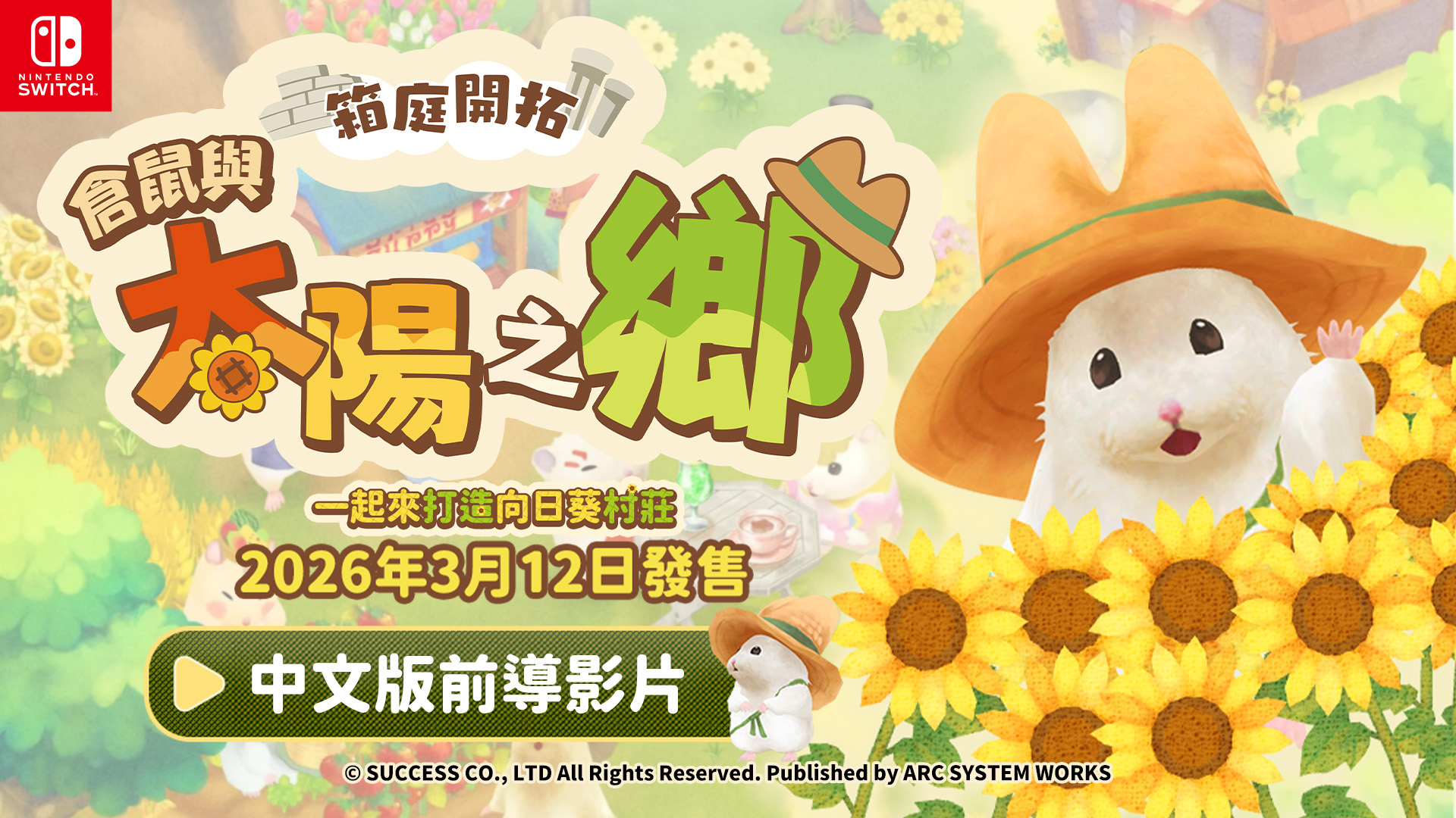 亞克系統亞洲(ARC SYSTEM WORKS ASIA)正式宣布,由 SUCCESS 公司開發的村莊經營模擬遊戲《箱庭開拓:倉鼠與太陽之鄉》中文版,確定於 3 月 12 日(四)在 Nintendo Switch™ 與 Steam® 平臺推出,並同步公開中文實體盒裝版及預購特典的詳細資訊。※ 實體版圖片為製作中示意圖,設計可能會有變更。《箱庭開拓:倉鼠與太陽之鄉》是以牧場模擬遊戲《Shepherd's Crossing》聞名的SUCCESS 公司所推出的最新作品。本作是一款開拓村莊的模擬遊戲,描繪倉鼠們在荒野中開墾土地、發展村莊,並召集夥伴倉鼠,一同打造熱鬧非凡的村落。遊戲中將登場包含黃金倉鼠、加卡利亞倉鼠在內,還有特里頓倉鼠、黑腹倉鼠等多種稀有品種倉鼠,為本作的一大特色。《箱庭開拓:倉鼠與太陽之鄉》中文版確定將於 3 月 12 日(週四) 以 Nintendo Switch™、Steam® 平臺推出;同時,Nintendo Switch™ 中文實體盒裝版也正在預購中■《箱庭開拓:倉鼠與太陽之鄉》繁體中文實體盒裝預售資訊Nintendo Switch《箱庭開拓:倉鼠與太陽之鄉》中文實體盒裝版目前正於各遊戲店家的實體及網路商店進行預售。預購《箱庭開拓:倉鼠與太陽之鄉》中文實體盒裝版就送「倉鼠與太陽之鄉導覽手冊」※ 「倉鼠與太陽之鄉導覽手冊」數量有限,可能會提前售罄。※ 「倉鼠與太陽之鄉導覽手冊」共44頁(包含封面),總頁數有可能會變更。※ 該圖片為示意圖,設計之後可能會變更。■ 《箱庭開拓:倉鼠與太陽之鄉》中文版官方網站https://www.arcsystemworks.asia/hamsunsun/tc/■ 《箱庭開拓:倉鼠與太陽之鄉》中文版前導影片https://youtu.be/qamCDuTGy4Y■ 《箱庭開拓:倉鼠與太陽之鄉》主要特色與可愛的倉鼠一起來打造向日葵村莊吧!●故事在森林的深處,那裡矗立著一座山。「從山頂掉落了許多向日葵的種子殼。」「那些試圖攀登這座山的人會激怒山神。」森林裡的動物們如此口耳相傳著。這座誰也不願意靠近的山,被稱為「無法攀登之山」。但是,在「無法攀登之山」的山頂……盛開著一朵巨大的向日葵。當兩隻倉鼠相遇的瞬間,那段「被遺忘的故事」也跟著揭開序幕。● 世界首創!打造專屬「我的倉鼠」玩家可從包含小露寶倉鼠在內的 5 種倉鼠品種中,自由搭配毛色、眼睛顏色與配件,創造屬於自己的分身倉鼠「我的倉鼠」。遊戲中也將登場牛頓倉鼠、黑腹倉鼠等稀有品種。● 種植、收成、料理,體驗悠閒療癒的慢活時光親手開墾田地、播種作物,培育各式蔬菜與農作物。收成後可製作美味料理與大家分享,或與其他物品進行交換,體驗溫馨又放鬆的生活節奏。● 善用地形高低差與水道,打造獨一無二的理想村莊超過 1,000 種村莊裝飾道具與多樣設施,能自由打造充滿活力的村落。玩家還可調整地形高低、從河川引水建造水道,逐步發展屬於倉鼠們的烏托邦世界!■ 《箱庭開拓:倉鼠與太陽之鄉》中文版遊戲畫面 遊戲名稱 箱庭開拓:倉鼠與太陽之鄉 平臺 實體盒裝版:Nintendo Switch™數位下載版:Nintendo Switch™、Steam® 上市日 預計2026年3月12日(四)上市 遊戲類型 箱庭開拓模擬遊戲 遊戲人數 1人 字幕語言 字幕:繁體中文、簡體中文、日文、英文、韓文 版權標誌 © SUCCESS CO., LTD All Rights Reserved. Published by ARC SYSTEM WORKS