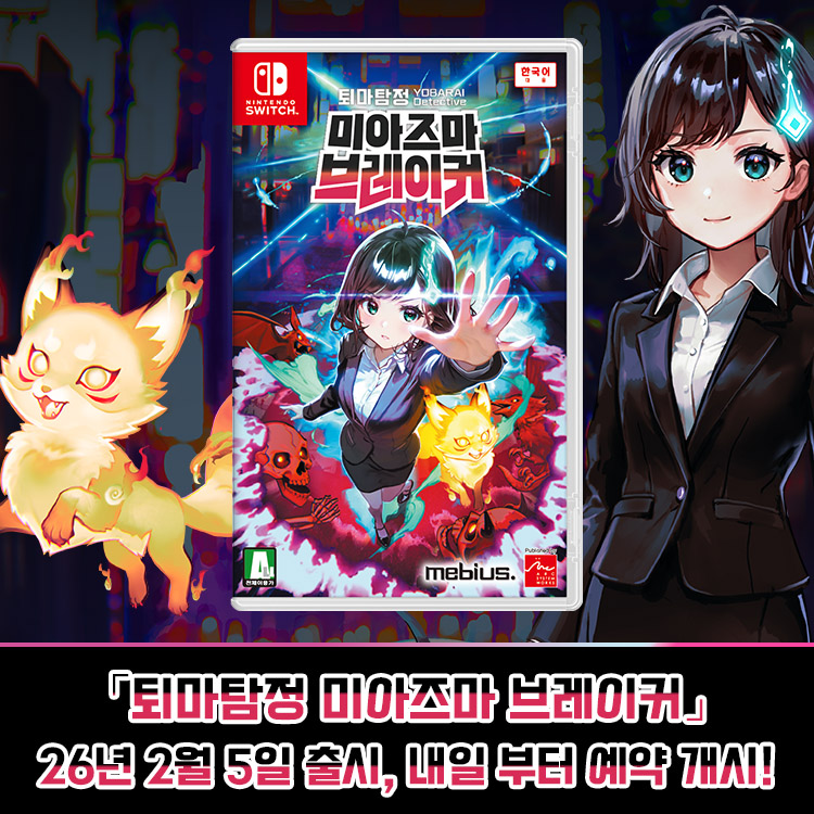 아크시스템웍스아시아 주식회사는 주식회사 mebius의 전방위 제령 액션 슈팅, 『퇴마탐정 미아즈마 브레이커』 한국어판이 Nintendo Switch™, Nintendo Switch™ 2용 소프트로 오는 2월 5일 (목) 출시가 결정되었다고 발표했다. 또한 내일 (9일, 금)부터 한국어 패키지판 (Nintendo Switch™)의 예약 판매가 시작된다고 밝히며, 예약 특전 등 상세 내용을 공개했다.※ 패키지 이미지는 제작 중인 예시로, 실물과 다를 수 있습니다.『퇴마탐정 미아즈마 브레이커』는 전방위에서 덮쳐 오는 대량의 악령 (미아즈마)를 퇴치하는 액션 슈팅 게임으로, 주인공 ‘키사라기 시노부’가 되어, 퇴마탐정으로서 밤거리에 꿈틀거리는 악령을 퇴치해야 한다. 아름다운 픽셀 아트와 3D가 융합된 스테이지 속에서, 플레이어는 ‘미아즈마’를 물리쳐 얻는 ‘혼’을 제령하여 레벨업을 하고, 이를 통해 다양한 스킬과 능력을 습득, 강화할 수 있다. 또한 임무 파트너 ‘수호령’과 함께 강력한 스킬을 사용하는 등 다양한 캐릭터 빌드를 구사하는 즐거움을 제공한다.『퇴마탐정 미아즈마 브레이커』 한국어판은 Nintendo Switch™, Nintendo Switch™ 2용 소프트로 오는 2월 5일 (목) 정식 출시되며, 한국어 패키지판 (Nintendo Switch™)의 예약 판매도 내일 (9일, 금)부터 시작될 예정이다.■ Nintendo Switch™ 『퇴마탐정 미아즈마 브레이커』 한국어 패키지판 예약 판매 안내Nintendo Switch™ 『퇴마탐정 미아즈마 브레이커』 한국어 패키지판의 예약 판매는 온, 오프라인의 각 스토어를 통해 내일 (9일, 금)부터 2월 3일 (화)까지 진행될 예정이며, 예약 구매 특전으로 『퇴마탐정 미아즈마 브레이커 아크릴 키링』가 수량 한정으로 증정된다.※ 예약 특전 『퇴마탐정 미아즈마 브레이커 아크릴 키링』의 사이즈는 60x60mm로, 추후 변경될 수 있습니다.※ 예약 특전은 한정 수량인 관계로 조기 소진될 수 있습니다.※ 해당 이미지는 제작 중인 이미지로, 디자인은 추후 변경될 수 있습니다.■ 『퇴마탐정 미아즈마 브레이커』 한국어판 트레일러■ 『퇴마탐정 미아즈마 브레이커』 주요 특징수호령과 함께 악령을 퇴치하라!전방위 제령 액션 슈팅● 스토리모두가 잠든 깊은 밤, 인적 끊긴 거리에는 어디선가 악령 미아즈마가 나타나 사람들에게 재앙을 불러일으키고 있었다.주인공 '키사라기 시노부'는 겉으로는 탐정 사무소에서 근무하는 직원이지만, 실상은 미아즈마를 퇴치하는 조직에 소속된 비밀 에이전트로서, 그녀는 심야에 나타나는 미아즈마에 맞서 매일 사투를 벌인다.그곳에서 그녀를 기다리고 있는 것은 과연…● 전방위에서 닥쳐오는 적을 퇴지하는 액션 슈팅제령 임무의 무대는 '주택가'와 '역 앞' 등 정적에 휩싸인 밤거리. 시노부의 공격과 수호령의 공격을 적절히 사용하여, 대량으로 나타나는 미아즈마에 맞서자!● 캐릭터 빌드미아즈마가 떨어뜨리는 영혼을 제령하여 레벨 업! 레벨이 오르면 다양한 레벨 스킬을 습득할 수 있다. 또한 수호령의 종류에 따라 공격 방식이 달라지므로, 레벨 스킬과의 조합이 임무 공략의 핵심.● 사무소에서 능력을 강화하자!시노부가 소속된 사무소에서는 기본 능력을 강화할 수 있다. 제령 임무의 보수를 소비하므로, 다양한 임무를 수행하여 능력을 강화시키자!● Nintendo Switch 2 Edition의 특징『퇴마탐정 미아즈마 브레이커 Nintendo Switch 2 Edition』에서는 해상도가 향상되어 더욱 섬세한 그래픽 표현이 가능해졌으며, 게임 플레이 또한 「Joy-Con™ 2」의 마우스 조작 모드를 지원한다.※ Nintendo Switch™ 버전에서 Nintendo Switch 2 Edition으로의 업그레이드 패스가 출시될 예정입니다.■ 『퇴마탐정 미아즈마 브레이커』 한국어판 스크린샷※ 모든 스크린샷은 개발 중인 화면입니다. 타이틀 명 퇴마탐정 미아즈마 브레이커 대응 기종 Nintendo Switch™ 패키지 & 다운로드 Nintendo Switch™ 2 다운로드 (※ Nintendo Switch™ 버전에서 Nintendo Switch 2 Edition으로의 업그레이드 패스가 출시될 예정입니다.) 출시일 2026년 2월 5일 (목) 출시 예정 장르 전방위 제령 액션 슈팅 플레이 인원 1명 언어 사양 자막 한국어, 일본어, 영어, 중국어 번체 권리표기 ©mebius. Published by ARC SYSTEM WORKS