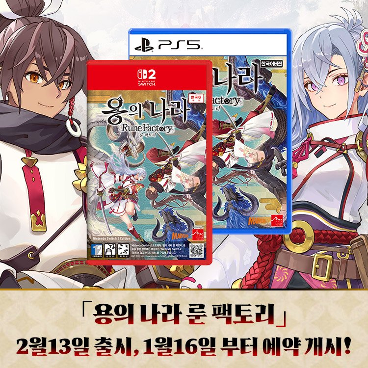 아크시스템웍스아시아 주식회사는 주식회사 마벨러스의 「룬 팩토리」 시리즈 최신작 『용의 나라 룬 팩토리』 한국어판이 Nintendo Switch™, Nintendo Switch™ 2, PlayStation®5용 소프트로 오는 2월 13일 (금) 출시가 결정되었다고 발표했다. 또한 내일 (16일)부터 한국어 패키지판 (Nintendo Switch 2 Edition, PlayStation®5)의 예약 판매가 시작된다고 밝히며, 예약 특전 등 상세 내용을 공개했다.※ 패키지 이미지는 예시로, 실물과 다를 수 있습니다.『용의 나라 룬 팩토리』는 판타지 세계에서 모험과 생활을 만끽할 수 있는 RPG 「룬 팩토리」 시리즈의 최신작으로, 서양을 무대로 전개되어 왔던 기존 시리즈와는 달리, 이번 신작에서는 동쪽의 나라 ‘아즈마’를 무대로 하는 새로운 모험과 생활을 즐길 수 있다. 플레이어는 모험과 생활 두 요소에 중요하게 작용하는 ‘춤’과 ‘마을 건설’을 통해 특별한 힘을 발휘하면서 마을을 부흥시켜 나가게 된다. 또한, 다양한 캐릭터들과 만나며 인연을 쌓아 나가고 그들과 연애, 나아가 결혼까지 하는 등 「룬 팩토리」 특유의 요소도 빠짐없이 즐길 수 있다.『용의 나라 룬 팩토리』 한국어판은 Nintendo Switch™, Nintendo Switch™ 2, PlayStation®5용 소프트로 2월 13일 (금) 정식 출시되며, 한국어 패키지판 (Nintendo Switch 2 Edition※, PlayStation®5)의 예약 판매도 내일 (16일, 금)부터 시작될 예정이다.※ Nintendo Switch 2 Edition 소프트웨어는 Nintendo Switch 본체로도 플레이할 수 있습니다. 이 경우, 플레이 내용은 Nintendo Switch 소프트웨어와 동일하며, Nintendo Switch 2의 성능을 활용한 업그레이드 내용은 포함되지 않습니다.■ 『용의 나라 룬 팩토리』 한국어 패키지판 예약 판매 안내『용의 나라 룬 팩토리』 한국어 패키지판 (Nintendo Switch 2 Edition, PlayStation®5)의 예약 판매는 온, 오프라인의 각 스토어를 통해 내일 (16일, 금)부터 2월 10일 (화)까지 진행될 예정이며, 예약 구매 특전으로 『용의 나라 룬 팩토리 캐릭터 아트북』이 수량 한정으로 증정된다.※ 예약 구매 특전 『용의 나라 룬 팩토리 캐릭터 아트북』은 한정 수량인 관계로 조기 소진될 수 있습니다.※ 『용의 나라 룬 팩토리 캐릭터 아트북』의 사양은 200x112mm 사이즈로, 총 60페이지 구성입니다. 사양은 변경될 수 있습니다.※ 해당 이미지는 제작 중인 이미지로, 디자인은 추후 변경될 수 있습니다.■ 『용의 나라 룬 팩토리』 한국어판 트레일러■ 『용의 나라 룬 팩토리』 주요 특징동쪽의 나라 ‘아즈마’를 무대로,새로운 모험과 생활이 펼쳐진다!● 이야기의 무대와 주인공동쪽의 나라, '아즈마'는 과거의 재앙 ‘용성붕락’으로 인해 대지는 산산조각이 되어 버리고, 룬 (활력)이 사라지면서 자연을 다스리는 신들마저 자취를 감추고 만다.기억을 잃은 주인공은 춤을 통해서 세상을 구하는 ‘대지의 무수’라는 역할을 맡게 된다.아즈마에 사는 사람들의 터전을 지키기 위해, 사라져 가는 자연을 되찾기 위해, 파트너 ‘모코롱’과 함께 신들을 찾아 떠나는 모험이 시작된다.주인공 ‘스바루’ (CV. Junya Enoki)대신룡의 사자 ‘모코롱’ (CV. Ai Kakuma)주인공 ‘카구야’ (CV. Yui Ishikawa)● 마을의 부흥과 춤을 통한 새로운 체험주인공은 ‘마을 건설’을 통해 마을의 부흥을 이끌어 나가게 된다. ‘마을 건설’은 밭을 일구어 작물을 키우는 것뿐만 아니라, 수로를 끌어와 물레방아를 설치하거나 집을 짓는 등 특정 장소에 건물과 장식물을 자유롭게 배치할 수 있다. 마을이 부흥해 나감에 따라서 마을에 활기가 생기면, 생활과 모험에 큰 도움이 되기도 한다.또한 이번 작품의 주인공은 ‘대지의 무수’로서 ‘춤’을 통해 ‘신기’의 숨겨진 힘을 발휘할 수 있다. 북을 들고 춤추어 작물을 성장시키거나, 검을 들고 춤추어 마물과의 전투에서 대미지를 입히는 등 모험부터 생활까지 다양한 상황에서 ‘춤’이 활약한다.● 시리즈 전통의 모험 · 생활 · 연애기존 「룬 팩토리」 시리즈와 같이, 플레이어는 낚시를 하거나 요리를 만드는 등 원하는 대로 시간을 보낼 수 있다. 또한 모험과 생활을 통해 다양한 캐릭터와 만날 수 있으며, 교류를 쌓아 나가며 사이가 좋아지면 함께 모험을 떠나거나 데이트를 신청할 수도 있다. 인연이 더욱 깊어지면 결혼도 가능하다. 스토리 및 연애 시나리오는 풀 보이스로 즐길 수 있다.※ 모든 스크린샷은 개발 중인 화면입니다. 타이틀 명 용의 나라 룬 팩토리 대응 기종 패키지판: Nintendo Switch 2 Edition, PlayStation®5 다운로드판: Nintendo Switch™, Nintendo Switch™ 2, PlayStation®5 출시일 2026년 2월 13일 (금) 출시 예정 장르 판타지 생활 게임 플레이 인원 1명 언어 사양 음성: 일본어, 영어 자막: 한국어, 일본어, 영어, 중국어 번체, 중국어 간체, 프랑스어, 독일어, 스페인어 권리표기 ©2025 Marvelous Inc. Published by ARC SYSTEM WORKS
