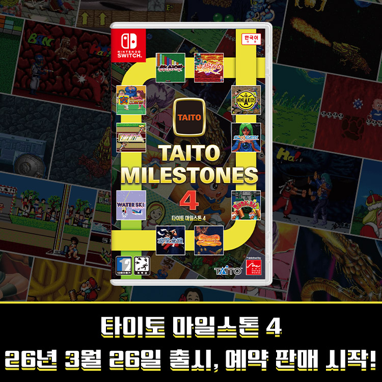 아크시스템웍스아시아 주식회사는 주식회사 타이토(TAITO CORPORATION)의 Nintendo Switch™ 버라이어티 게임, 「타이토 마일스톤 4」 한국어 패키지판 & 다운로드판이 일본판과 동일한 2026년 3월 26일 (목)에 출시가 결정되었다고 발표하며, 수록 타이틀의 정보를 공개했다.「타이토 마일스톤 4」는 타이토의 80~90년대 인기 아케이드 타이틀 10종을 엄선한 Nintendo Switch™용 버라이어티 게임 소프트로, 현재 3편까지 출시된 「타이토 마일스톤」 시리즈의 최신작이기도 하다.다수의 아케이드 게임을 이식한 『Arcade Archives』 시리즈를 제작하고 있는 주식회사 HAMSTER의 개발 협력으로 제작되는 이번 『타이토 마일스톤』 시리즈 제 4탄에서는, 블록 깨기의 결정판 『알카노이드 (ARKANOID)』와 트랙 볼 게임의 명작 『사이발리온 (SYVALION)』을 비롯한 1980~90년대 초의 타이토 명작 액션 게임 10종을 즐길 수 있으며, 일부 타이틀은 USB 마우스 조작을 지원한다. 「타이토 마일스톤 4」는 아크시스템웍스 아시아를 통해 한국어 패키지판 & 다운로드판이 일본판과 동일한 오는 3월 26일 (목) 출시될 예정이다.■ 「타이토 마일스톤 4」 수록 타이틀 소개1) 『워터 스키 (WATER SKI)』 (1983년작)모터보트에 끌려가는 수상스키 선수를 조종하여 장애물을 피하며 골을 향해 나아가는 게임으로, 작은 장애물은 점프로 피하거나, 점프대를 이용한 화려한 묘기를 선보이며 고득점을 노려야 한다. 완주하면 훌라 댄서가 춤추는 섬에서 추가 점수를 얻을 수 있는 찬스까지!?2) 『THE운동회 (FIELD DAY)』 (1984년작)어느 여자 기숙사의 운동회를 배경으로, 타이밍 버튼과 두 개의 액션 버튼으로 다채로운 경기에 도전하자. 2인3각, 120m 릴레이 등 다채로운 7종목이 준비되어 있다. 최대 4인 플레이를 지원하며, 2명씩 시합에 참가할 수 있다.3) 『여자 산시로 (TYPHOON GAL)』 (1985년작)유키가 도장 깨기에 도전! 펀치와 로우킥 등의 소기술로 상대의 체력을 줄이고, 업어치기나 브레인버스터 등 대기술로 마무리! 태풍걸의 대활약!4) 『알카노이드 (ARKANOID)』 (1986년작 / USB 마우스 조작 지원)광자력 우주 모선 '알카노이드'를 습격한 수수께끼의 전투기. 스페이스 크래프트 '바우스'가 정체를 밝히기 위해 출격하지만, 이차원 미궁에 갇히고 마는데...알카노이드로 귀환하기 위한 방법은 단 하나. 차원 요새 'DOH'를 격파! 고전적인 블록 깨기를 발전시킨 액션 퍼즐 게임.※ 스테이지 구성은 「EGRETⅡ mini」 수록판과 동일합니다.5) 『지옥 순례 (BONZE ADVENTURE)』 (1988년작)난장판이 되어 버린 지옥계에 질서를 되찾기 위해, 부처님으로부터 '마파주'를 전수받은 각련 스님과 동선 스님이 지옥을 순례하는 액션 게임으로, 다양한 요괴를 물리치면서 이상해진 염라대왕이 있는 곳에 도착하여, 모든 악의 근원을 쓰러트려야 한다.6) 『공리금단 (KURI KINTON)』 (1988년작)때는 세기말. 폭력에 의해 세상의 패권을 노리는 집단들이 만연하는 시대.WSPO (세계 그림자 경찰 기구)의 정보부원이 미국 정부를 위협하는 집단의 본거지를 파악하지만, 딸과 함께 납치되고 만다. 두 사람과 세계를 구하기 위해 공력진권의 달인 '공리금단'이 싸움에 나서는 격투 액션 게임.7) 『사이발리온 (SYVALION)』 (1988년작 / USB 마우스 조작 지원)메카닉 드래곤 '사이발리온'을 조종하여, 지구를 침략하려는 수수께끼의 군대를 막아라!플레이할 때마다 스토리가 변화하며 ‘RAIMAIS’, ‘DARIUS’와 같은 다른 타이토 게임의 세계와 크로스오버 되기도 하는 등 100종류 이상의 엔딩이 준비되어 있다.8) 『돈도코돈 (DON DOKO DON)』 (1989년작)평화로운 나라 ‘MARRY LAND’에 사는 나무꾼 노인 ‘밥’과 ‘짐’이 되어, 납치된 왕과 공주를 구출하기 위해 구름 위의 성을 향해 나아가는 2인 협력 플레이가 가능한 액션 게임. 망치로 방해꾼을 박살 내자!9) 『카멜 트라이 (CAMELTRY)』 (1990년작 / USB 마우스 조작 지원)화면을 회전시켜 공을 골대 안으로 유도하는 액션 게임으로, 셰이크 버튼을 누르면 공이 점프하고, 계속 누르고 있으면 스피드가 상승. 4종류의 코스에서 최속 클리어를 노려라!10) 『닌자 키즈 (THE NINJA KIDS)』 (1990년작)때는 세기말. 인형들이 평화롭게 사는 도시가, 악마의 부활을 꾀하는 일당에게 점령당하고 마는데…악행을 저지하기 위해, 닌자 가문의 인형사에 의해 만들어진 4체의 닌자 인형이 악에 맞서는 액션 게임으로, 최대 4인 플레이가 가능하다.※ 수록 게임 내 자막은 외국어입니다. 메뉴 및 게임 내 매뉴얼은 한국어입니다. 타이틀 명 타이토 마일스톤 4 출시일 2026년 3월 26일 (목) 출시 예정 대응 기종 Nintendo Switch™ 패키지 & 다운로드 장르 버라이어티 플레이 인원 1~4명 언어 사양 (자막) 한국어, 일본어, 영어, 중국어 번체, 중국어 간체, 프랑스어, 이탈리아어, 포르투갈어, 독일어 ※ 수록 게임 내 자막은 외국어입니다. 메뉴 및 게임 내 매뉴얼은 한국어입니다. 권리표기 © TAITO CORPORATION Published by ARC SYSTEM WORKS