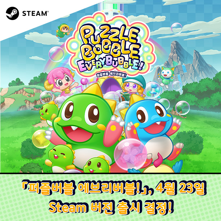 아크시스템웍스아시아 주식회사는 주식회사 타이토가 개발한 『퍼즐버블』 시리즈 최신작 「퍼즐버블 에브리버블!」의 Steam 이식판이 2026년 4월 23일 (목) 출시 결정되었다고 발표했다.■ 「퍼즐버블 에브리버블!」 한국어 공식 사이트https://www.taito.co.jp/ko/PBEverybubble■ ‘버블룬’이 돌아왔다! 액션 퍼즐의 익숙한 재미는 그대로, 새로운 요소는 한가득!「퍼즐버블 에브리버블!」은 마법사의 저주로 섬 전체가 버블로 가득 차버린 ‘레인보우 아일랜드’를 무대로, ‘버블룬’, ‘보블룬’, ‘쿠루룬’, ‘코로론’이 모여 모험을 펼치는 액션 퍼즐 게임으로, 같은 색의 버블 3개를 위로 쏘아 올린 후 맞혀서 터트리는 심플하면서도 심오한 규칙을 유지하면서도 이번 작품만의 새로운 요소가 가득 탑재되어 있다.■ 『퍼즐버블』 시리즈 최초! 스토리 모드에서 최대 4인 협력 플레이 지원!스토리 모드에서 시리즈 최초로 최대 4명까지의 협력 플레이를 지원하는 것이 주요 특징으로, 혼자서 느긋하게 즐길 수 있는 것은 물론, 가족이나 친구와 함께 협력해서 스테이지를 공략하는 즐거움도 느낄 수 있다.■ 다채로운 콘텐츠! 다양한 기믹의 스테이지와 유니크한 게임 모드모험의 무대가 되는 ‘레인보우 아일랜드’ 각지에서는 엔드리스 스테이지 『스컬 타워』는 물론, 『스페이스 인베이더』와의 콜라보레이션 미니 게임, 『퍼즐버블vs인베이더』를 즐길 수 있다.■ 충실한 대전 모드 수록!전 세계 플레이어와 정점을 향해 나아가는 ‘온라인 대전 모드’와 함께, ‘로컬 대전 모드’에서는 최대 4명이서 즐길 수 있는 팀 대전을 실현하여, 2vs2 협력 대전과 같은 다채로운 규칙으로 플레이할 수 있다.■ 오늘부터 찜 목록에 등록 시작!Steam 제품 페이지를 통해서 오늘부터 「퍼즐버블 에브리버블!」을 자신의 찜 목록에 추가할 수 있다.● 「퍼즐버블 에브리버블!」 Steam 페이지https://store.steampowered.com/app/3990960/PuzzleBobble_EveryBubble/■ Nintendo Switch™ 「퍼즐버블 에브리버블!」 한국어판 절찬 판매 중!Nintendo Switch™ 「퍼즐버블 에브리버블!」 또한 아크시스템웍스 아시아를 통해 패키지 및 다운로드 버전으로 절찬 판매 중이다.■ Nintendo Switch™ 「퍼즐버블 에브리버블!」 한국어판 트레일러● 아크시스템웍스 아시아 제품소개 페이지https://www.arcsystemworks.asia/bbs/board.php?bo_table=products&wr_id=177& 타이틀 명 퍼즐버블 에브리버블! 출시일 Nintendo Switch™: 절찬 판매 중 Steam®: 2026년 4월 23일 (목) 출시 예정 대응 기종 Nintendo Switch™: 패키지판 Nintendo Switch™, Steam®: 다운로드판 장르 액션 퍼즐 게임 플레이 인원 1~4명 ※ 온라인 플레이 최대 2명 지원 언어 사양 자막: 한국어, 중문번체, 중문간체, 일본어, 영어, 프랑스어, 이탈리아어, 독일어, 스페인어 권리표기 © TAITO CORPORATION/ Published by ARC SYSTEM WORKS