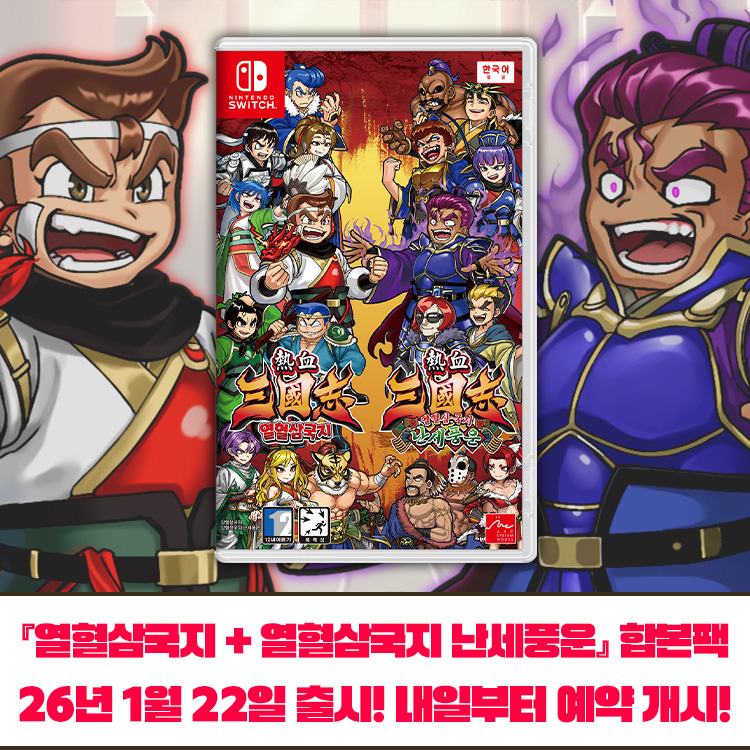 아크시스템웍스아시아 주식회사는 인기리에 판매 중인 열혈 코믹 액션 시리즈 『열혈삼국지』와 『열혈삼국지 난세풍운』을 하나의 패키지로 담아낸 Nintendo Switch™ 합본 패키지 『열혈삼국지 + 열혈삼국지 난세풍운』이 2026년 1월 22일 (목) 출시가 결정되었다고 발표했다. 또한, 『열혈삼국지 + 열혈삼국지 난세풍운』 합본 패키지의 예약 판매가 내일 (19일, 금)부터 시작된다고 밝히며, 예약 특전 등 상세 내용을 공개했다.■ 『열혈삼국지 + 열혈삼국지 난세풍운』 예약 판매 안내『열혈삼국지』와 『열혈삼국지 난세풍운』 두 타이틀을 하나의 세트로 구매할 수 있는 실물 합본 패키지 Nintendo Switch™ 『열혈삼국지 + 열혈삼국지 난세풍운』의 예약 판매가 온, 오프라인의 각 게임 스토어를 통해 내일 (19일, 금)부터 2026년 1월 20일 (화)까지 진행될 예정이다.● 『열혈삼국지 + 열혈삼국지 난세풍운』 수록 타이틀1) Nintendo Switch™ 『열혈삼국지』 한국어판 게임 본편2) Nintendo Switch™ 『열혈삼국지 난세풍운』 한국어판 게임 본편● 예약 구매 특전: 「열혈삼국지 + 열혈삼국지 난세풍운 스티커 세트」『열혈삼국지 + 열혈삼국지 난세풍운』을 예약 구매하면, 예약 구매 특전으로 「열혈삼국지 + 열혈삼국지 난세풍운 스티커 세트」이 증정된다.※ 「열혈삼국지 + 열혈삼국지 난세풍운 스티커 세트」는 각 170x110mm의 사이즈입니다.※ 「열혈삼국지 + 열혈삼국지 난세풍운 스티커 세트」는 4개의 스티커가 한 세트로 구성되어 있습니다.※ 예약 구매 특전은 한정 수량인 관계로 조기 소진될 수 있습니다.※ 해당 이미지는 제작 중인 이미지로, 디자인은 추후 변경될 수 있습니다.■ 『열혈삼국지』 게임 소개'열혈 시리즈'로 친숙한 '쿠니오'가이번에는 삼국지 세계에서 활약!?● 『열혈삼국지』 한국어판 제품 소개 트레일러● 난세에 펼쳐지는 장대한 모험스토리 모드에서는 ‘황건적의 난’이나 ‘적벽대전’ 등 삼국지의 장대한 스토리가 『열혈 시리즈』 특유의 장난기 넘치는 맛으로 어레인지되어 있으며, 최대 2명의 협력 플레이로 친구와 함께 적들을 물리쳐 한층 더 신나게 플레이할 수 있다.● 누구나 손쉽게 즐길 수 있는 액션!버튼을 누르기만 해도 발동되는 다채로운 필살기로 앞을 가로막는 적들을 시원하게 무찌르자!10가지의 화려한 계략을 상황에 맞게 사용하여, 전황을 단숨에 유리하게 만들 수 있다.● 최대 4명과 함께 즐기는 협력 & 난전 플레이!최대 4명의 플레이어가 온라인 또는 오프라인 환경에서 함께 협력 플레이를 즐길 수 있는 ‘삼국영웅록 ~적벽의 장~’에서는 강력한 보스가 기다리고 있는 10개의 스테이지를 즐길 수 있다. 총 24명의 캐릭터를 고를 수 있으며, 설정을 통해 아군까지도 공격할 수 있어 『열혈 시리즈』 특유의 난전을 마음껏 즐길 수 있다.■ 『열혈삼국지 난세풍운』 게임 소개‘적벽대전’ 이후, 천하의 세력은 위・촉・오로 나뉘고…드디어 삼국에 의한 패권 싸움이 발발!● 『열혈삼국지 난세풍운』 한국어판 제품 소개 트레일러● ‘열혈 시리즈’만의 IF 스토리를 즐기자!유명한 장수들을 계속해서 새롭게 동료로 맞이하는 ‘유비 진영’과, 그것을 뛰어넘는 숙적 ‘조조 진영’ 간의 불타는 공방을 중심으로, ‘열혈 시리즈’만의 과감한 어레인지를 더한, 지금껏 보지 못한 IF 스토리를 즐길 수 있다.● 「적토마」를 타고 적들을 물리쳐라!『열혈삼국지 난세풍운』에서는 「적토마(바이크)」를 타고 스테이지 이동이 가능하다. 「적토마」를 탄 상태에서는 도중에 출현하는 적들과 부딪혀 날려버릴 수 있다. 또한 전용 파츠를 입수하여 커스터마이즈를 할 수 있어 자신이 원하는 대로 「적토마」를 개조할 수 있다. 게다가 특정 조건을 달성하면, 「적토마」가 바이크 외의 다른 탈 것으로 진화하게 되는 경우도…?● 화려한 「계략」과 「필살기」가 한가득!삼국지하면 빼놓을 수 없는 통쾌한 「계략」! 『열혈삼국지 난세풍운』에서는 스테이지에 불화살을 내리는 「화계」와 강물을 범람시켜 주변 적들을 진영체로 쓸어버리는 「수계」, 그리고 동료 무장을 소환할 수 있는 새로운 계략도 등장한다. 플레이어는 「계략」과 「필살기」를 조합하여 다양한 적들이 도사리고 있는 유니크한 스테이지를 공략해 나가야 한다. 타이틀 명 열혈삼국지 + 열혈삼국지 난세풍운 대응 기종 Nintendo Switch™ 패키지판 출시일 2026년 1월 22일 (목) 출시 예정 가격 54,800원 장르 열혈 코믹 액션 플레이 인원 1명 언어 사양(자막) 한국어, 영어, 중국어 번체, 중국어 간체 권리표기 © ARC SYSTEM WORKS