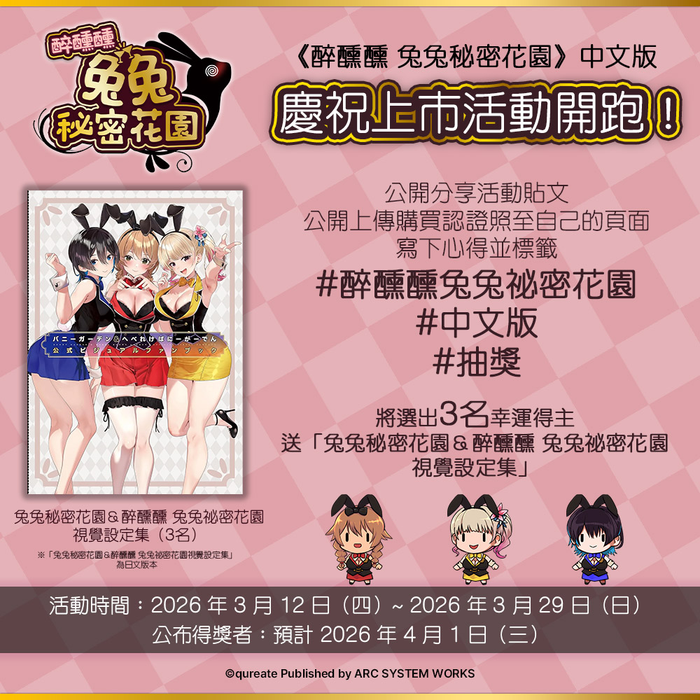 亞克系統亞洲(ARC SYSTEM WORKS ASIA)宣布, qureate 公司的醉步蹣跚動作遊戲Nintendo Switch™ 《醉醺醺 兔兔秘密花園》中文版於今日(12日)上市,並舉辦慶祝上市活動。《兔兔秘密花園》為曾經迷倒全球紳士、掀起話題熱潮的作品,其番外篇確定將以動作遊戲形式《醉醺醺 兔兔秘密花園》推出。在本作中,玩家將操作因酒醉而步伐東倒西歪的前作女主角,一邊克服回家路上接連不斷的各種危機,一邊努力護送她平安返家。過程中不僅能體驗層出不窮的突發狀況,回到家後還能體驗充滿魅力的夜間日常。■ 《醉醺醺 兔兔秘密花園》中文版慶祝上市活動為慶祝《醉醺醺 兔兔秘密花園》中文版上市,從今天起舉辦抽獎活動。公開上傳中文實體盒裝版購買認證照或是遊玩遊戲的畫面並留下關於本作的感想,就有機會得到「兔兔秘密花園&醉醺醺 兔兔祕密花園視覺設定集」。抽獎活動詳情如下。● 活動時間:2026 年 3 月 12 日(四)起至 2026 年 3 月 29 日(日)● 活動獎品:「兔兔秘密花園&醉醺醺 兔兔祕密花園視覺設定集」(預計抽3名)※ 「兔兔秘密花園&醉醺醺 兔兔祕密花園視覺設定集」為日文版本● 活動參與辦法:1. 點擊 亞克系統亞洲 粉絲專頁讚。2. 公開分享該活動貼文。3. 將《醉醺醺 兔兔秘密花園》中文版購買認證照公開上傳至自己的「個人Facebook」動態,寫下對本作的感想,同時標籤 #醉醺醺兔兔祕密花園 #中文版 #抽獎※參加活動前請詳閱活動辦法。※購買認證照可上傳購買之遊戲軟體照、能夠證明購買的照片等,請勿使用非本人的圖片參與活動,經主辦單位發現或經第三人檢舉,則主辦單位有權取消使用者之參與、得獎資格,主辦單位不另行通知。※購買認證照請公開上傳到「自己的Facebook上」,若未上傳到自己的Facebook視同未參加活動。※請勿以人頭帳號、分身假帳號重複留言,若使用者以人頭等假帳號或電腦駭客程式等不正當之手段參與活動,經主辦單位發現或經第三人檢舉,則主辦單位有權取消使用者之參與、得獎資格,主辦單位不另行通知。● 官方Facebook粉絲專頁貼文:● 公布得獎者:2026 年 4月 1 日(三)於亞克系統亞洲官方社群媒體公布。■《醉醺醺 兔兔秘密花園》遊戲介紹● 《醉醺醺 兔兔秘密花園》中文版前導預告https://youtu.be/6ZIk0gG0WtI● 故事為了撫慰紳士們每日疲憊心靈的樂園「兔兔秘密花園」,在它營業時間結束後,展開了另一段故事……。今晚,花奈、凜、美羽香三人也如往常一樣,在兔兔秘密花園度過了愉快的時光。只不過,這次她們似乎喝得比平時稍微多了一點點。腦袋昏昏沉沉,步伐也東倒西歪……。即便如此,她們還是要回到家裡,只為了明天能再次帶著笑容迎接紳士們的到來。然而,就在她們抱持著這樣的心情踏上歸途時,各種突發狀況卻在回家的路上接踵而至!花奈、凜、美羽香,3人究竟能否平安回到家中呢!?● 角色1) 花奈(CV. Mio Hoshitani)新人服務員。個性天真爛漫,能夠以開朗、溫柔的態度待人。 靠著爽朗的笑容療癒客人。為了實現夢想,不顧父親反對的堅持搬來東京生活。2) 凜(CV. Eri Suzuki)個性自由奔放又和藹的服務員。不會和客人畢恭畢敬,都以朋友口吻說話。與外表相反,其實是超愛看動漫的宅宅。喝醉後會大肆暢談自己喜歡的動漫。3) 美羽香(CV. Masumi Tazawa)口無遮攔,已有無數客人慘遭無情言語的利刃而心碎。但是本人絕對沒有惡意。和比自己年紀小很多的妹妹一起生活,肩負扶養妹妹的責任。擔任服務員的資歷比其他兩位還要長。● 主要遊戲系統- 喝到醉醺醺的服務員,究竟能否平安回到家中!?玩家的任務就是操作搖搖晃晃的角色,平安把她送回家!在連直線都走不穩「醉步蹣跚」的狀態下,閃避潛伏在夜晚街道中的各種危險吧!- 接連不斷的突發狀況!一頭栽進垃圾桶裡動彈不得、屁股卡在人孔蓋裡出不來……!?克服接二連三襲來的麻煩,護送東倒西歪的服務員平安到家吧!- 搭載PTA系統(Panties Tactically Acquired 收集・超多・內褲吧)!回家路上不知道為什麼掉滿了各種內褲……!?撿到的內褲可以直接更換!當然,設定上回家後都有好好洗乾淨再穿的,不必擔心衛生問題!蒐集豐富的設計款,體驗專屬於你的內褲穿搭!這就是本作獨創的「PTA(Panties Tactically Acquired 收集・超多・內褲吧)」系統!- 回到家中,沉浸在女孩們的夜間日常時光!以醉醺醺的狀態直接撲進床裡?那可不行!為了明天也能在兔兔秘密花園奉上最棒的服務,必須做好萬全準備。舒展身體的瑜伽、放鬆身心的泡澡時光。最後用化妝水仔細護膚。這才是專業服務員的夜間日常!只要在關卡中拿到高分,就能解鎖服務員們在家裡的私密日常場景!來挑戰高分吧!- 穿上你喜歡的服裝回家吧!滿足特定條件,就能解鎖全新服裝!寬大的男友襯衫、經典的兔女郎套裝等,款式應有盡有。讓她換上你最喜歡的裝扮,體驗一場特別的回家之旅吧! 遊戲名稱 醉醺醺 兔兔秘密花園 發售日 現正販售中 平臺 Nintendo Switch™(實體盒裝版&數位下載版) 遊戲類型 醉步蹣跚動作遊戲 遊戲人數 1人 語言 字幕:繁體中文、簡體中文、韓文、日文、英文語音:日文 版權標誌 ©qureate Published by ARC SYSTEM WORKS